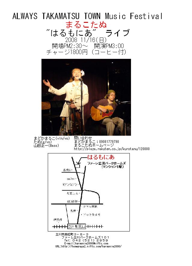 ALWAYS TAKAMATSU TOWN Music Festival まるこたぬライブ 決定 日時:11/16(日) 開場:PM2:30 開演:3:00 場所:はるもにあ(立川) チャージ:1800円(コーヒー付) まどかまるこ(Vin/vo) たぬ(G/Vo) 山田正一(Bass) よろしく!!