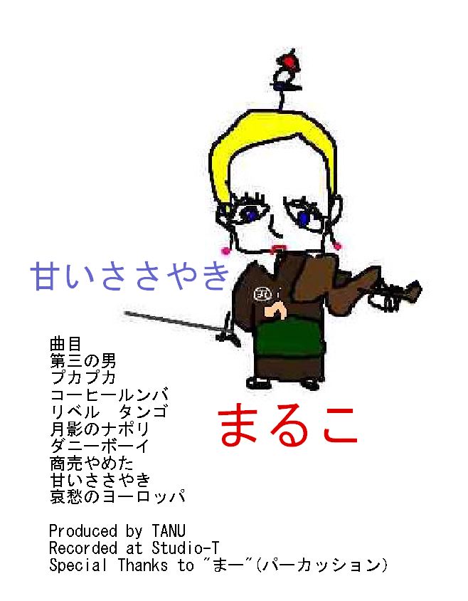 まるこさんの2nd CD”甘いささやき” ができました 曲目 第三の男 プカプカ コーヒールンバ リベル タンゴ 月影のナポリ ダニーボーイ 商売やめた 甘いささやき 哀愁のヨーロッパ Produced by TANU Recorded at Studio-T Special Thanks to ”まー”(パーカッション) 1枚1500円 Studio-Tもしくはライブ会場にて販売します。 Studio-T たぬ