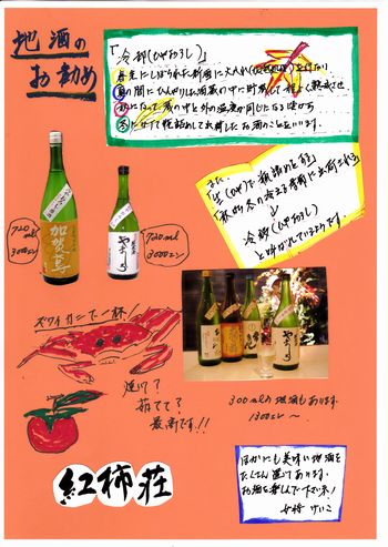お帰りなさい 今日は朝から快晴でした。さわやかな秋の空、リュックを担いで山登り 最高の山歩きの日になりました。主人は朝からそわそわ、そわそわ、2時間ほど山歩きに行ってきました。 私は家から一歩も出ないでお留守番でした。 お留守番の間に、先日の 「ひやおろし」の紅柿荘 「 地酒お勧め 」 を作りました。 蟹さんに見えますか? 柿に見えますか?下手な絵!わたしが~!!! 少しずつ勉強してゆきます。 紅柿荘ホームページhttp://www.kousisou.jp/index.htmlちょっとひと押し お願い! 人気ブログランキングへ
