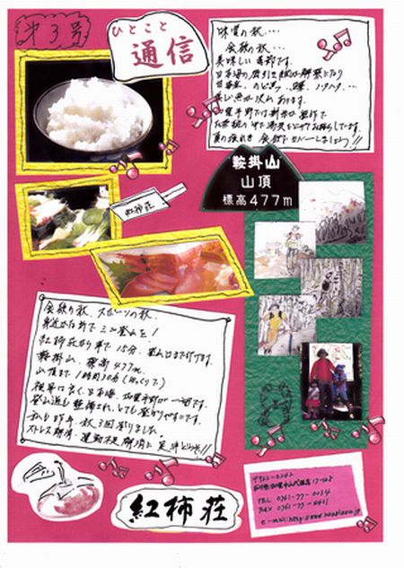 お帰りなさい 今日は朝から快晴でした。昨夜から気温が下がり気持ちの良い一夜を過ごしましたが今日はまた30度以上の天気で暑い日だったですがエアコンをつけるほどではなく最高の秋の日でした。 昨日書きました 「 ひとこと通信 第3号 」 作りました。梅岡さんに教えていただき、私のきもちの熱いうちに作らなくてはと今日は午後机に座り構えて作ってみました。出来栄えいかがでしょうか!! 難しく、時間がかかりましたがとても良い勉強になりました。 これからも情報と感動伝えてゆきたいと思います。 紅柿荘ホームページhttp://www.kousisou.jp/index.htmlちょっとひと押し お願い! 人気ブログランキングへ