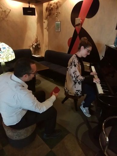 お帰りなさい!! 暖かい朝でしたが気温はあまり上がらず風邪気味の体調です今日のコーヒータイムの出来事ですいつもは同じ仲間の集まりですが今日は素敵なお客様がコーヒータイムをされました中東の方からハネムーンに日本を旅行されているとのこと珈琲を飲まれ日本の煎餅のおやつをジャパニーズクッキーとお勧めすると喜んで食べておられましたピアノ弾いてよいですかとのことで!!(写真)会話は英語ですが日本語は少しわかりますがスマホ便りです私も新婚さんに幸せいただきましたハッピー ハッピー紅柿荘と和田酒店のホームページを見てくださいね!!見てください紅柿荘ニューホームページ和田酒店ホームページ ちょっとひと押し お願い! 人気ブじログランキングへ