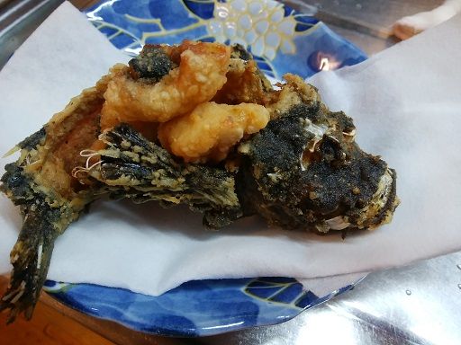 お帰りなさい!! 今日から6月です今日は寒いと感じるような冷ややかな雲の多い一日でしたオコゼのから揚げ凄い顔したオコゼ!!コラーゲンが沢山ありそうな皮骨や顔 頭もカリカリに揚げて丸ごと食べますお客様にお出しした時私にも一匹揚げてくれました右手前の黒いところが顔でよく見ると大きい口と小さい目が見えますとてもおいしいです今トビウオや鯵が美味しいです紅柿荘と和田酒店のホームページを見てくださいね!!見てください紅柿荘ニューホームページ和田酒店ホームページ ちょっとひと押し お願い! 人気ブじログランキングへ