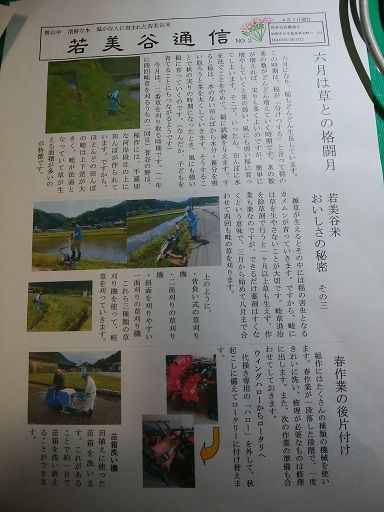 お帰りなさい!!最高気温26度と丁度良い気温です私の実家の街で生産組合を作ってお米作りをされている方がお米の配達の時に読んでくださいと持ってきて頂いました昔からの丁寧な米作りで生産されたお米田んぼは一度壊して今うとお米作りの田んぼになるまでには手入れと時間がかかるとか今の季節は草取り水の管理日照時間が少ないと成長に問題が台風が 風が強く吹くと苗が倒れ虫や病気が心の休まる暇がないですお米は一年中精魂込めて作られてます美味しいお米に感謝いたします紅柿荘と和田酒店のホームページを見てくださいね!!見てください紅柿荘ニューホームページ和田酒店ホームページちょっとひと押し お願い! 人気ブじログランキングへ