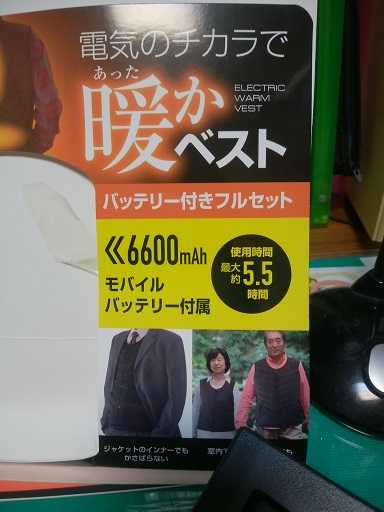 お帰りなさい!!今日は久々に良いお天気になりました不足するものがあり一人でぶらりと買い物に出ました今年の寒さはとんでもない寒さ先日体感温度ー8度とかあまりの寒さに貼るカイロを貼ったり着るものを厚いものに変えたり苦心算段しましたそんなこと考えながらホームセンターの中を歩いていると近頃テレビで宣伝している電気の力で暖かベストがホームセンターにありましたどうしようか迷ったのですが寒がりの主人のために一枚買いました初めの設定が悪かったのかあまり暖かくないと思い説明書を読みもう一度挑戦したところ背中がぽかぽかとても暖かです大したものです!!紅柿荘 ホームページ和田酒店 ホームページちょっとひと押し お願い! 人気ブじログランキングへ