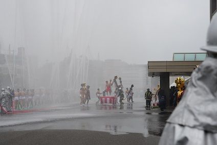 勢い良く上がる放水の中に裸で的を振る消防団員