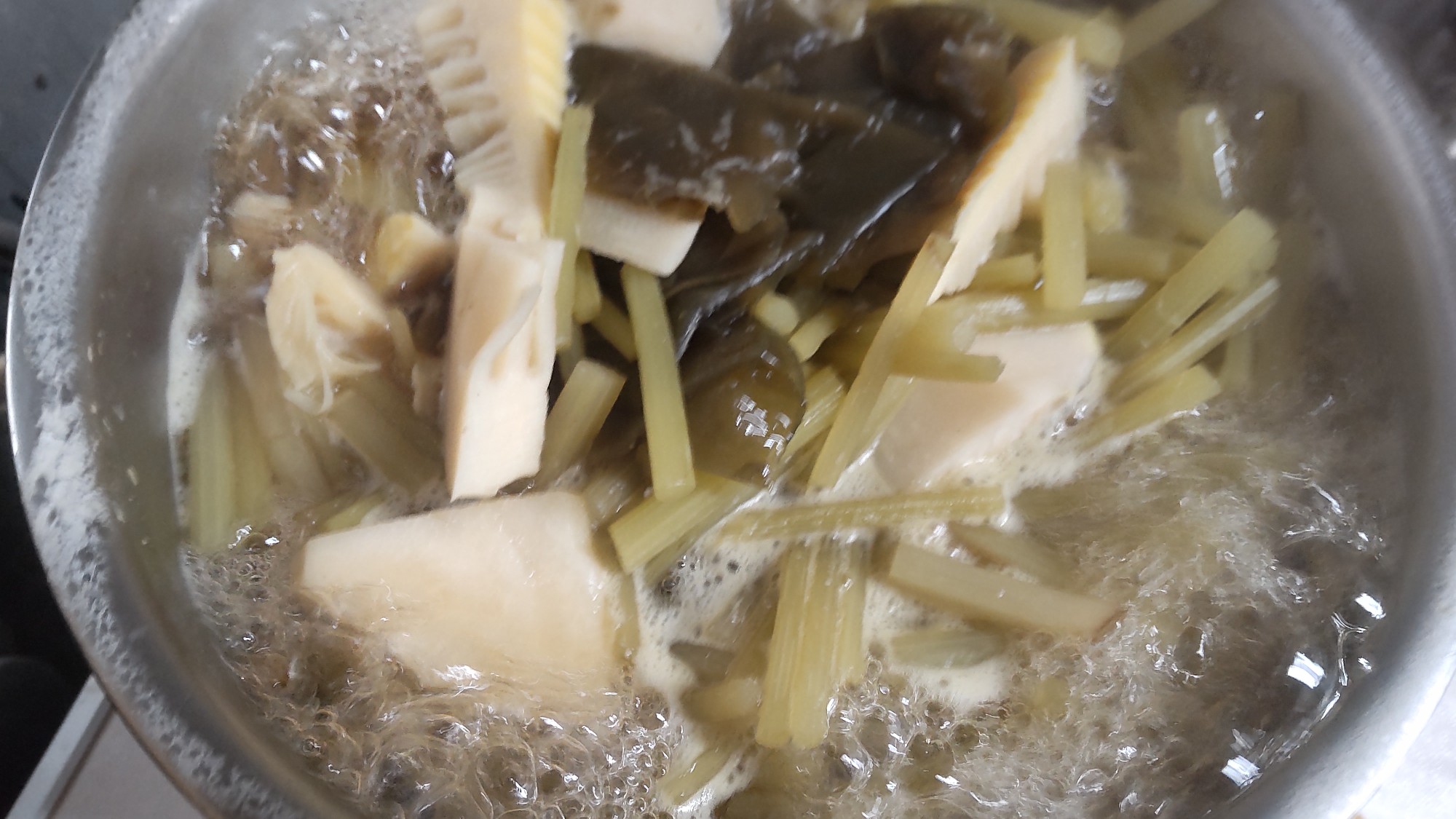 お帰りなさい!!今日は薄曇りの一日加賀平野は田植えの準備で賑わっていました今日のお迎え花です元気村へ行くと新鮮なタケノコがありました姉がフキを持ってきてくれたので茹でてあく取しました竹の子とフキと昆布のお煮しめ我が家の夕食の一品ができました竹の子 フキはあくが強いので食べ過ぎないように気を付けます旬のものはとっても美味しいです