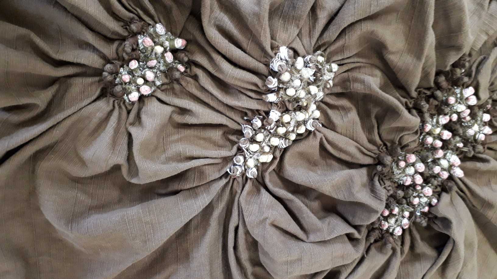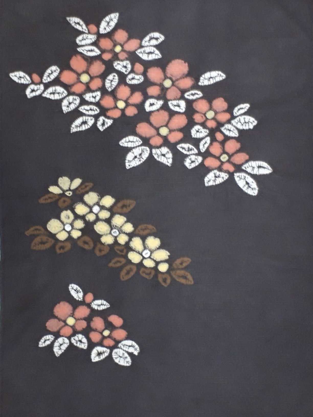 2回目は茜(アルミ媒染)で染めて赤い花の部分を絞り、3回目は玉ねぎ(鉄媒染)で染めました