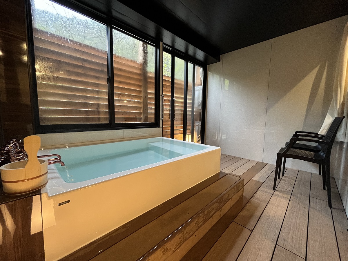 24年改装【源泉内風呂付/川沿い】ツイン+和リビングルーム 4月13日(土)、川沿いに面した新滝に『源泉内風呂付客室』がオープンいたしました! 2022年に半露天風呂付き客室をオープンし大変ご好評をいただいておりましたが大人さまのみのご案内とさせていただいておりました。お子様とのご利用のご要望をたくさんいただいておりこの度、お子様もご利用可能な客室をご用意させていただきました。最大4名様までご利用いただけます。 ゆとりある内湯をしつらえ、源泉湯浴みをプライベートな空間でお楽しみいただける客室です。 ベッドルーム(ツイン)と4.5畳の畳スペースのある和リビングルームを備えています。寛ぎの空間と寝室が分かれておりゆったりとお過ごしいただけます。 家族水入らずの時間を過ごしたい方にピッタリのお部屋です。ぜひご利用くださいませ。<こちらは川沿いに面した新滝の客室です。姉妹館 千代滝とは徒歩4分の距離です>新滝プラン一覧を見る《Information》【新滝】24年改装【源泉内風呂付/川沿い】ツイン+和リビングルーム\ファミリーやグループ旅行におすすめ/限定1室の客室です。ゆとりある内湯をしつらえ、源泉湯浴みをプライベートな空間でお楽しみいただけるお部屋です。ベッドルーム(ツイン)と4.5畳の畳スペースのある和リビングルームを備えています。寛ぎの空間と寝室が分かれておりゆったりとお過ごしいただけます。源泉内風呂は大人2名でのご入浴も可能な広さで、お子様連れのご家族にもおすすめです。※2名様を超える方はチェックイン前に、畳にお布団を敷いてお迎えいたします。夕食時にお布団敷をご希望の場合は「宿への要望」欄からお知らせください。■源泉内風呂+シャワー+トイレ付(ウォシュレット)■ベッドルーム(ツイン)+和リビングルーム■定員:1名様から4名様まで【主な備品】冷暖房/金庫/液晶テレビ/冷蔵庫(空)/温冷水ポット/ドライヤー/浴衣と帯/アメニティセット/手提げ袋