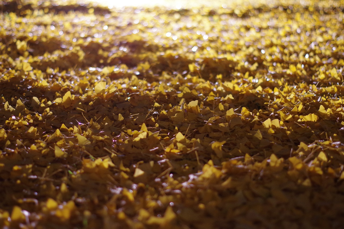 ほとんどが舞い散った後には、ふかふかの黄色の絨毯が。
