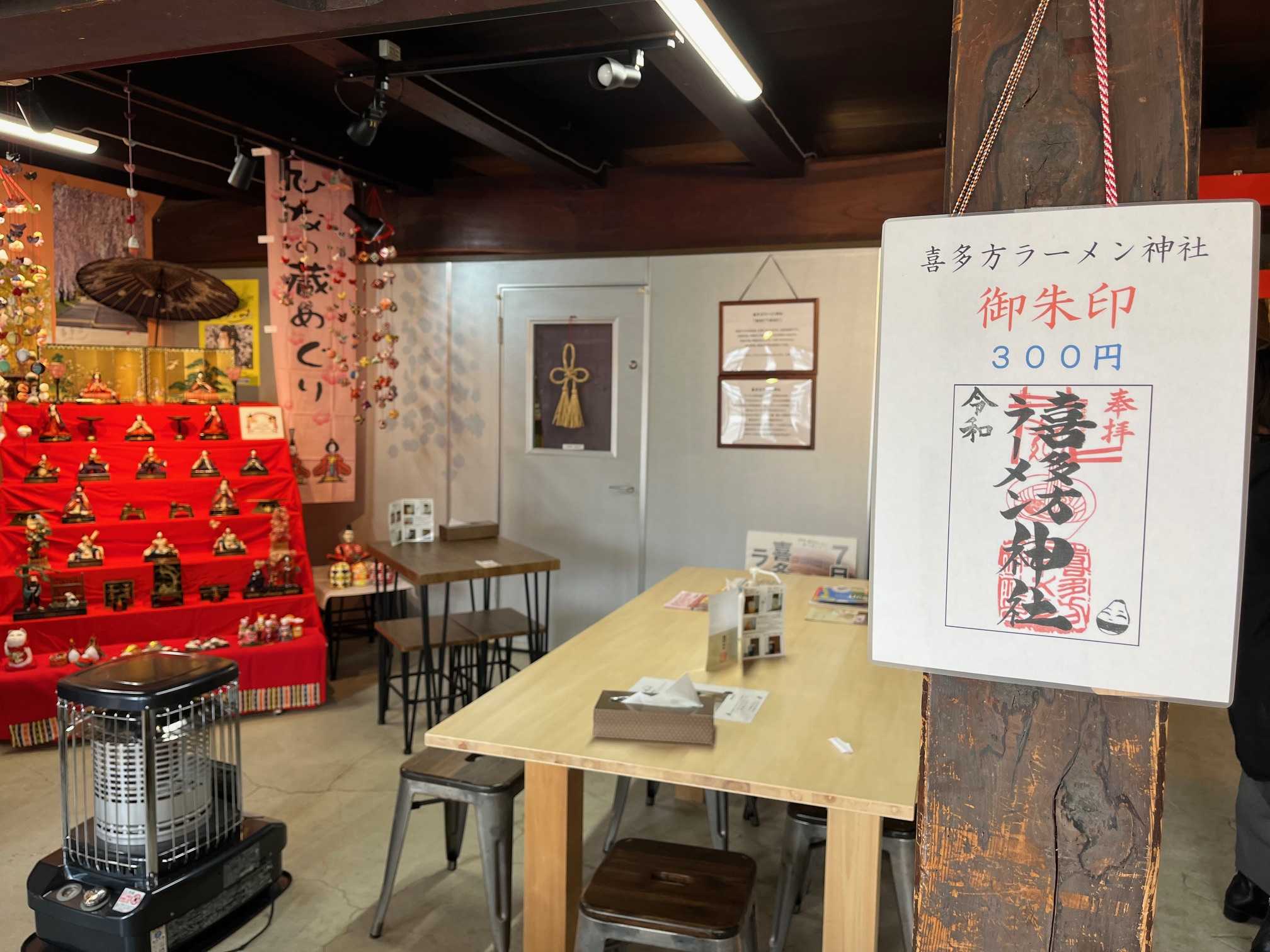 左上の絵馬にある青い丼は、120年前、初めて喜多方らーめんが提供された丼なんだそうです。