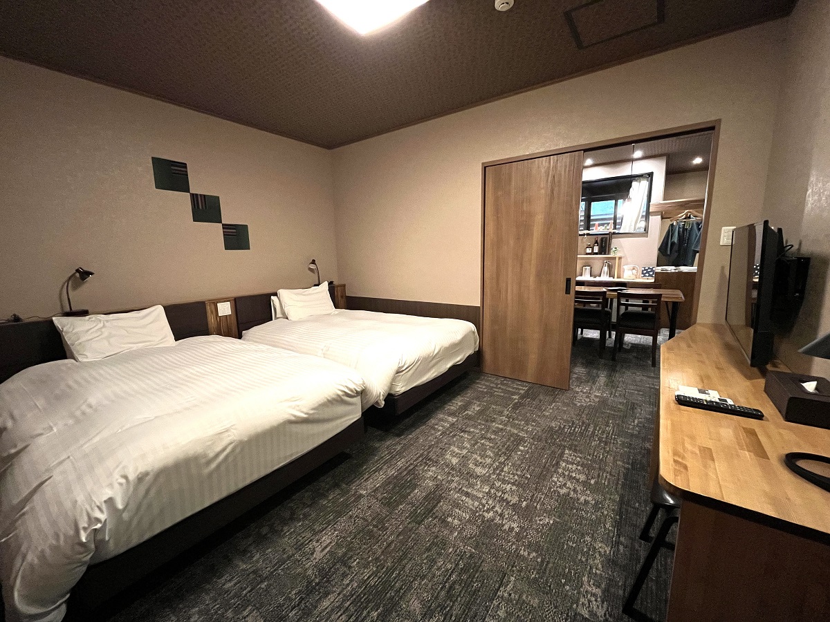 ベッドルーム(ツイン)と4.5畳の畳スペースのある和リビングルームを備えています。