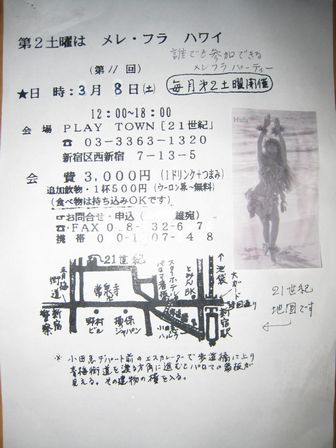 ちょっと遅くなりましたが、8日(土)に行った111回のメレフラハワイについて。当日は、暖かい日でしたので、期待したのですが、まあまあのお客さんの入りでした。フラの人たちは、いつも来ていただいている人たちがあまりいなかった割には、新しい人や久しぶりに来ていただいた人たちがお見えになり賑やかになりました。演奏するほうもスティールやボーカルの新しい人が見えたりして、(先月見えた学生時代の先輩も続けてきていただきました)これまた楽しく演奏していただきました。途中から、バッキー白方さんの四男の健さんもお見えになり、すばらしいギターを披露していただき、やっぱりプロの方だなという格の違いを実感しました。健さんありがとうございました。ともあれ、111回何とか終了いたしました。