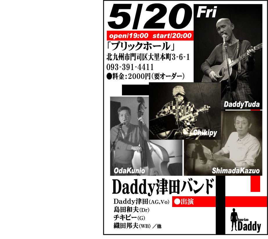 今週は元憂歌団のドラマー島田和夫さんを加えて門司と大分・九重町でライブをやります!5/20 20時~ 『ブリックホール』 北九州市門司区JR門司駅北口徒歩3分出演:Daddy津田BAND Daddy津田(VO.,A.G.) ちきぴー (A.G.) 織田邦夫(W.B.) 島田和夫(Dr., ex.憂歌団) 他料金:2,000円5/21 19時~ 『マヤスタジオ』 大分県九重町右田2187-2 090-5386-9378 (永楽) 出演:Daddy津田BAND Daddy津田(VO.,A.G.) ちきぴー (A.G) TOMO (B.) 島田和夫 (Dr., ex.憂歌団) 由見BAND 他 料金:1,000円.