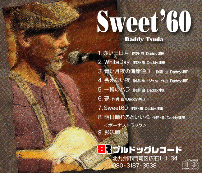 7月8日は旧「Office 78」が誕生した由来の記念日でした。ちょっとしたキッカケで今年の4月から気持ちも新たに「ブルドッグレコード」と変更するようになったけどね。でも「ブルドッグレコード」って名前気に入っています。先日の会議で代表は「office 78」に引き続きルージュωと決定しました[m:87]って、二人だけの幹部会議やけどね(笑)ほんでもって、「ブルドッグレコード」プロデュースの第1弾CDがDaddy津田の『Sweet'60』で第2弾がルージュωの『ルージュωが歌うDaddy津田の世界』で今回15日神戸「Voice」のツアーから販売いたします[m:76]『Sweet'60』Daddy津田 <販売価格:2,000円>1.赤い三日月(アコースティックな8ビートサウンドに変わりました)2.White Day(ようやく発表するラブソング)3.青い月夜の海岸通り(ウクレレで歌うカリプソサウンド)4.会えない夜(ルージュω作詞で曲調はモータウンサウンド)5.一輪のばら(以前のゆるやかな感じから今回は8ビートに変わりました)6.夢 (アコースティックギター1本のラブソング)7.Sweet'60(今回のタイトル曲でちきぴーのギターの特徴が出てます)8.明日晴れるといいね(高石ともやさんも気に入ってくれた曲です)<ボーナストラック>9.影法師*レコーディングの最中に出来た曲で今回は収録する予定ではなかったんですが、ちきぴーと今回のレコーディングエンジニアをしてくれた大分「fサウンドカフェ」のjohnnyさんのごり押し(笑)でガットギターでちょろっと入れてしまいました(笑)*<参加ミュージシャン>Daddy津田(Vo.,A.G.)ちきぴー(A.G.、E.G.、KeyB.、Cho.)Johnny (A.G.、Cho.)Tomo (E.B.)fサウンドカフェコーラス隊『ルージュωが歌うDaddy津田の世界』<販売価格:1,000円> CD-R全曲Daddy津田の詞曲にルージュωが詞を補足しています。1.White Day(競作です。こちらはスローなシャッフルです)2.あっぷるプルプルぷるりんこ(4番の歌詞をルージュωが加えました)3.ふかし芋(私が母を思い出して作った曲)4.サンポ(ご存知イクイクサウンドです)5.大好きだよ(ワルツのラブソング)6.恋するロッケンローラー(私のDJ、ちきぴーのエレキギターとアメリカンテイストの仕上がりになってます)<参加ミュージシャン>ルージュω (Vo.)Daddy津田 (A.G.,Cho.)ちきぴー (E.G.,E.B.)本日は地元で「オカリナいずみ」「あべこ」の女性2人を招いてのライブです。7/9 19:00~ 『そわある』 北九州市門司区栄町11-7 093-321-1007 出演:ちきぴー、Daddy津田、 オカリナいずみ(福岡)/サポート:さかけん(G)、あべこ(福岡) 料金:チップスタイル