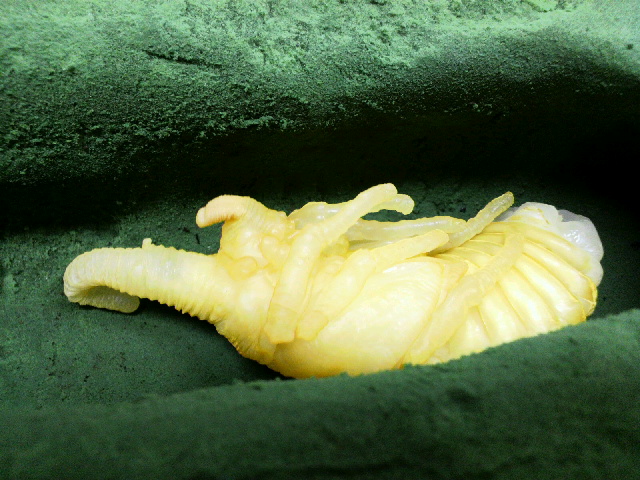 昨夜、ヘラクレス蛹化の瞬間に出くわしました 結構細かく画像に収めたのでアップしますね~(^_^) 幼虫が仰向けになって真っ直ぐになります 頭から背中にかけて割れて中から蛹が見えてきます ちょっとアップで モコモコと動きながら徐々に中から‥‥ 出てきたのは胸角です 胸角を徐々に伸ばしながら幼虫の頭の割れ目から見えてきたのが頭角です さらに顔と前脚の部分が見えてきて‥‥ 最後にお尻の部分が脱げて一応、蛹にはなりました幼虫の頭が割れ始めてからここまでわずか10分くらいなので生で見れるのは結構貴重ですね(^u^) 幼虫の抜け殻です でっクワガタの蛹化ならここまで来ればだいたい大丈夫なんですがカブトの特にヘラクレスのような角の長い種類はここからが問題なんですちゃんと真っ直ぐ角が伸びなきゃ高く売れな‥‥い、いやっ、カッコ悪いから(^_^;) で、続きの画像をアップしようと思ったらまさかの‥‥『一日の登録可能サイズが上限を超えているため、アップロードに失敗しました。』 って‥‥そんなのあるの(-o-;) 明日に続く‥‥