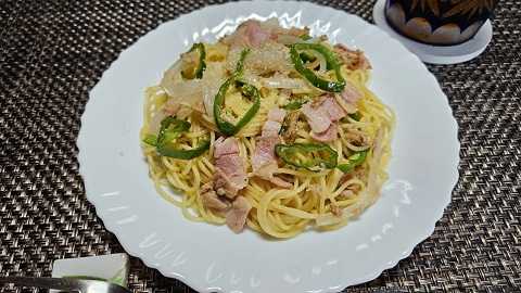 玉ねぎ、ピーマン、シーチキン、残り物のベーコンを炒めて