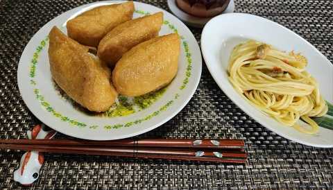 麺に飽きてお昼にご飯を炊き、冷蔵庫にあった味付けのいなり用お揚げでいなり寿司。