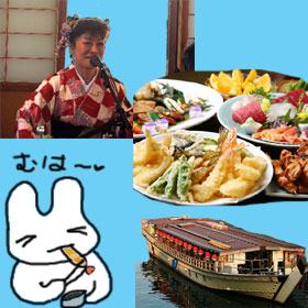 昨日は「楽香」でお呼ばれでした。江戸の「粋」を私たちに教えてくださる師匠に屋形船に連れて行って頂いたのです。師匠和装。男性の和装は本当、かっこいい。(女性もだけどね)出演は柳家紫文師匠と東京ガールズ。写真は東京ガールズの粋なお姐さんです。大きな船盛りのお刺身に熱々の天ぷらが次から次へと…。浅草橋から出発して台場に停泊。お三味線の音色と艶やかな声にうっとり。お座敷遊びも色々やって、おおいに盛り上がり、夕景に心を奪われて、夢のように時間は過ぎて行きました。同じ卓を囲んだ方もステキで大人なご夫妻。お二人で世界を船旅なさってるとか…憧れちゃいます。見聞きするものがみんな新鮮でステキでした。師匠をはさむように座った私とらくちゃん。本来なら、両手に花のはず(ま、楽香に花は求められておりませんが…)が、実は私もらくちゃんも二人とも腰を痛めておりました。妙な動きの妙齢な婦人を引き連れた師匠。せっかくの「粋」が……マジ、すみませんでした。へへ。いつもありがとうございます。ポチに関係ないけど…屋形船…夫はお留守番でした。ごめんね。本日の懺悔でした。