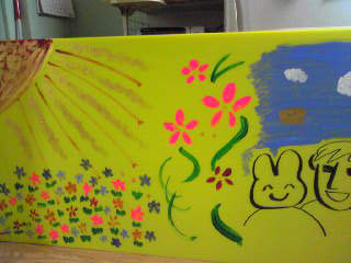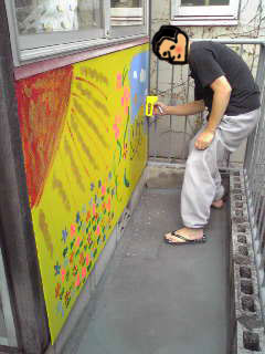 我が家のベランダに建っている掘っ立て小屋。壁がずいぶんの悲しい感じになってきた。夫が外からちょっと手を入れると言って板を買ってきた。その板(たたみ一畳分くらいの大きさ)に絵を描いた。えへへ。アクリル絵の具で一日かけて描いたよ。…わかるかなー?お日様の光と、雲のひとつが金色だ!!これを外壁に打ち付ける。すごいぞ。最高の風水だ。超お金持ちになっちゃったら…みんな家に遊びに来てね!うなぎをご馳走しちゃうよっ!!風水効果を楽しみにしててねー!!家中絵が描いてあるんだよ。洗濯機とか…冷蔵庫とか…たんすとか…。最初抵抗していた夫だけど、慣れたらしい…うっしっしっ。