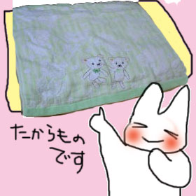 私のたからもの紹介します。今年の母の日に姪の「ビキ」がくれたタオルです。くまさんのミニタオル。枕にかけて毎晩すりすりして寝ています。えへ。