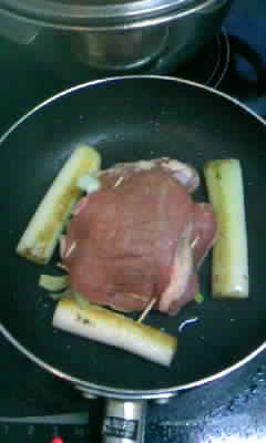 ブロック肉をスライスして間にネギを入れて楊枝で閉じて焼きました。