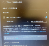 卒業式と修了式が終わったと思う間もなく、風邪をひいてしまいました。卒業式のYouTubeライブ中継のことだけ、忘れないうちに書いておきます。=========================△学校のネットワークではYouTubeライブの配信ができないことが直前になって判明。 なんと、ストリーム配信に対応できるだけの仕様になっていなかった! (ライブ配信の直前までは正常。配信開始と同時に円がくるくる回って、 待ってりゃいいのかと思っていたら、いつまで待っても配信開始されない。 学校のネットはダウンロードに比べてアップロードがほとんどできないようです・・・。) →〇結局、モバイルWi-FiルーターとSIMカードの組み合わせで、 学校のネットワークとは別のネットワークを使用しておこなった。 〇「Webカメラから」の簡単配信設定で通信量を抑制することにより、 2時間の配信を2GB弱の消費でまかなえた。△「Webカメラから」の簡単配信設定では音質があまりよくなくて 音が7秒間隔ぐらいで少し途切れる。 →ただ、配信を視聴していた人によると、「別に気にならなかった」とのこと。・ビデオカメラ1台にPCをつないで配信。 〇ビデオカメラの場所を移動させる際、三脚の下にはめるタイプのキャスターを使った。 便利だった。↓ カメラ三脚 キャスター付き デジカメスタンド(サンワダイレクト、税込み4580円)△電源ケーブルを外した状態でのPCの充電が思ったよりも、もたなかった。 (中古で2万円で買ったパソコンだったから?)△配信中にノートパソコンのふたをとじると、画面がロックされて、 配信を復活できない。△一度不具合で配信が止まると、復活できない。 予備機を用意していたが、同じ配信URLで別機に差し替えることができない。 →同一URLは無理なので、すぐに別URLを取得して、 不具合のURLに「こちらに移行」と書いておいて誘導するしかないか?・個人情報漏洩防止のため、限定配信で行い、翌日には「非公開」に再設定した。=========================失敗もいっぱいしましたが、とりあえず、8割くらいは成功したような気もします。今後YouTubeライブで配信を予定している方に、少しでも参考になれば、幸いです。。。(関連する過去記事)▼YouTubeライブの中継テストをやってみました! (2021/02/22の日記)▼卒業式のためのYouTubeライブ中継実験について、分かったことの追記 (2021/02/25の日記)▼卒業式のためのYouTubeライブ中継実験~ビデオカメラからでも簡易設定できた!~ (2021/03/02の日記)