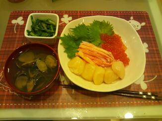 ・海鮮丼(かに・いくら・ホタテ) ・ほうれん草のおひたし ・あさりのお味噌汁 お久しぶりになってしまいました。 4日の結婚式ではしゃぎ過ぎたのか 余興のお手伝いで緊張しすぎたのか・・・ また持病で寝込んじゃってました。 今回は仕事も2日間お休みしてしまいました。 ま、過ぎたことは仕方ない、気分新たに行きましょう だいぶ遅れましたが ひな祭りのお祝いを我が家でもしました。 ちらし寿司は作るのが大変そうなので、海鮮丼で 11日の日曜は 妹の就職祝いをかねて実家に帰ります。 手作りケーキを作ったんですが 型にクッキングシートを敷くのを忘れてしまい・・・ ちゃんと型から抜けるのか不安です 家計簿・体重管理は明日の分から再開します