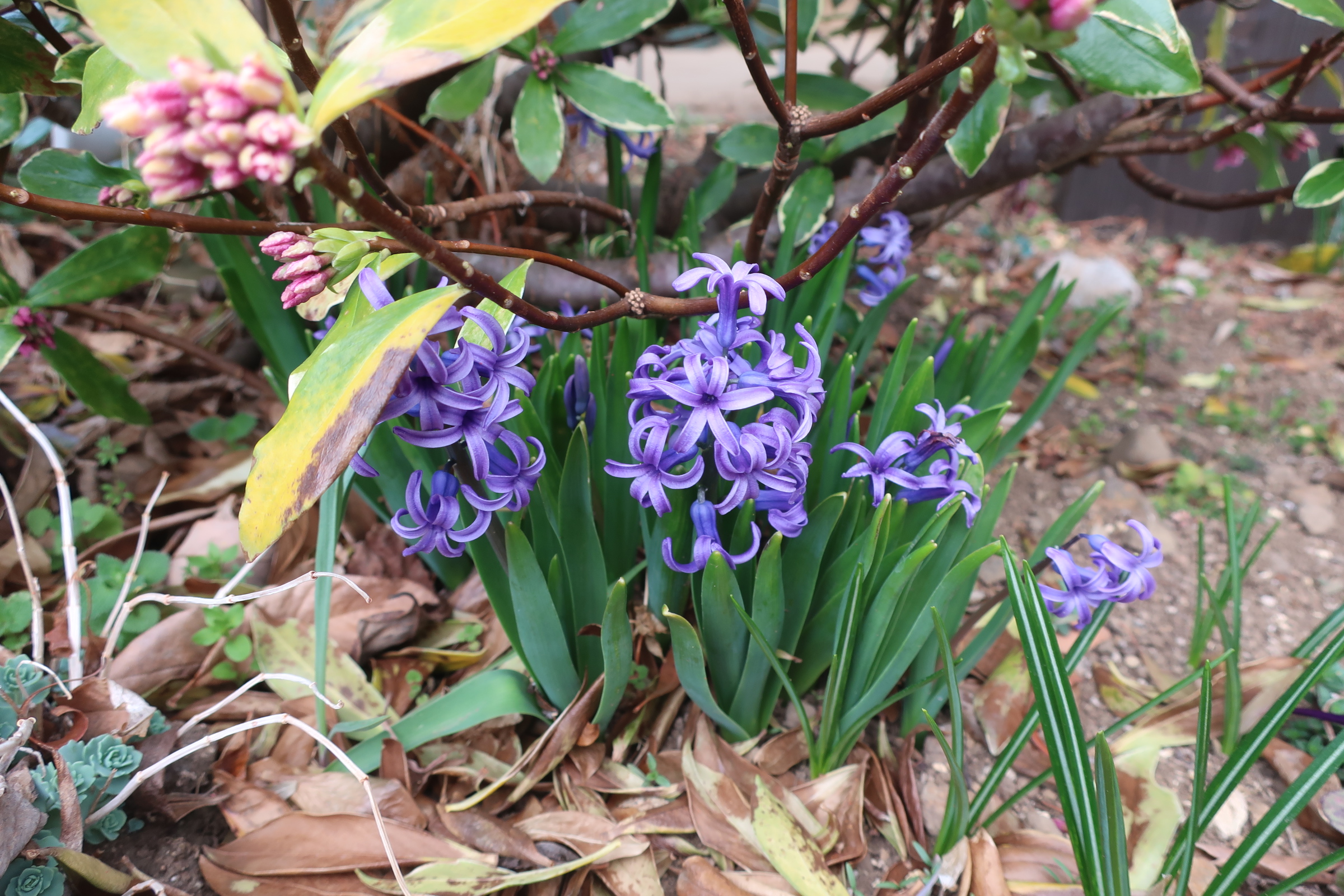 ヒヤシンスの上には、沈丁花も咲き始めているから、この辺りが香水の香り。💕