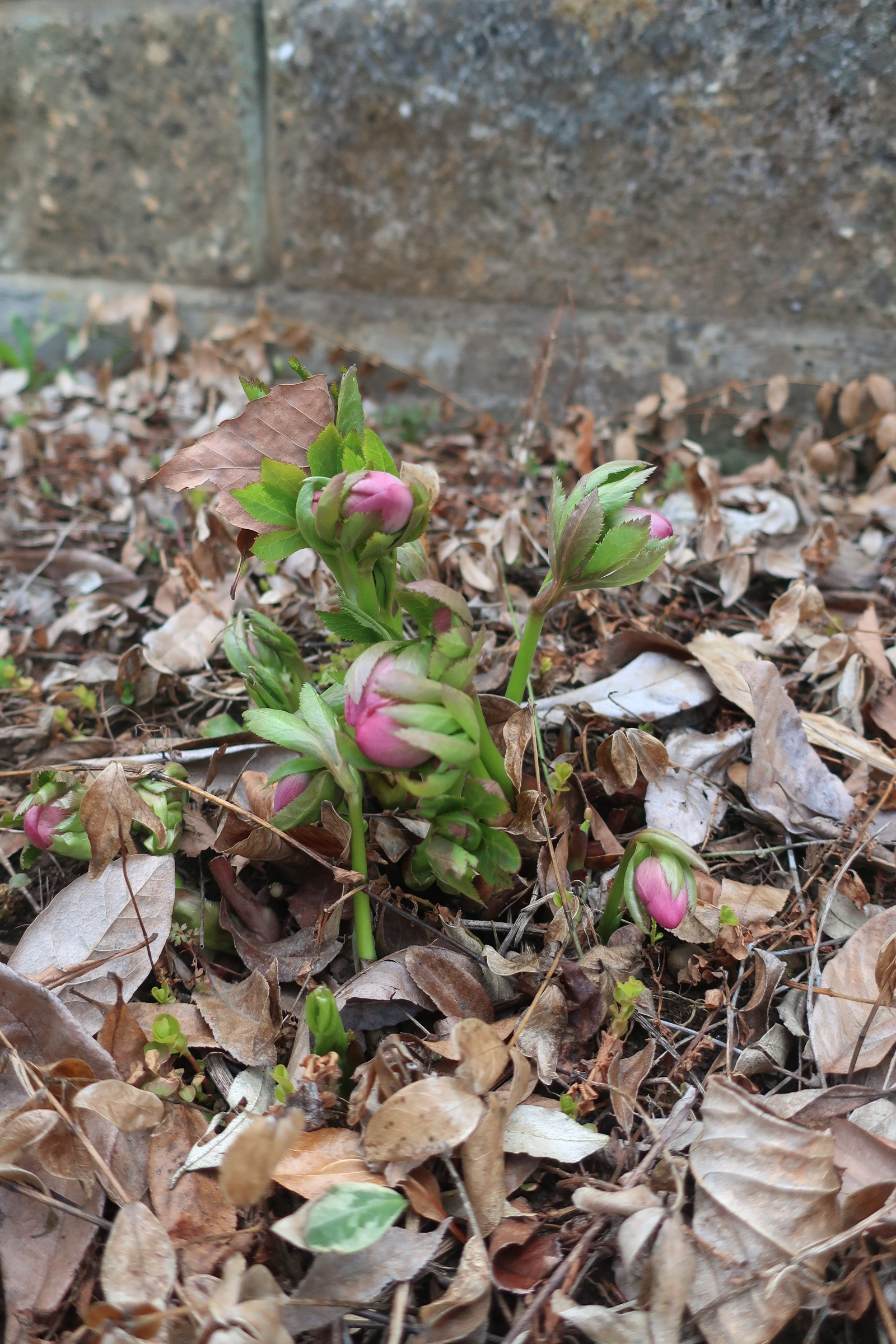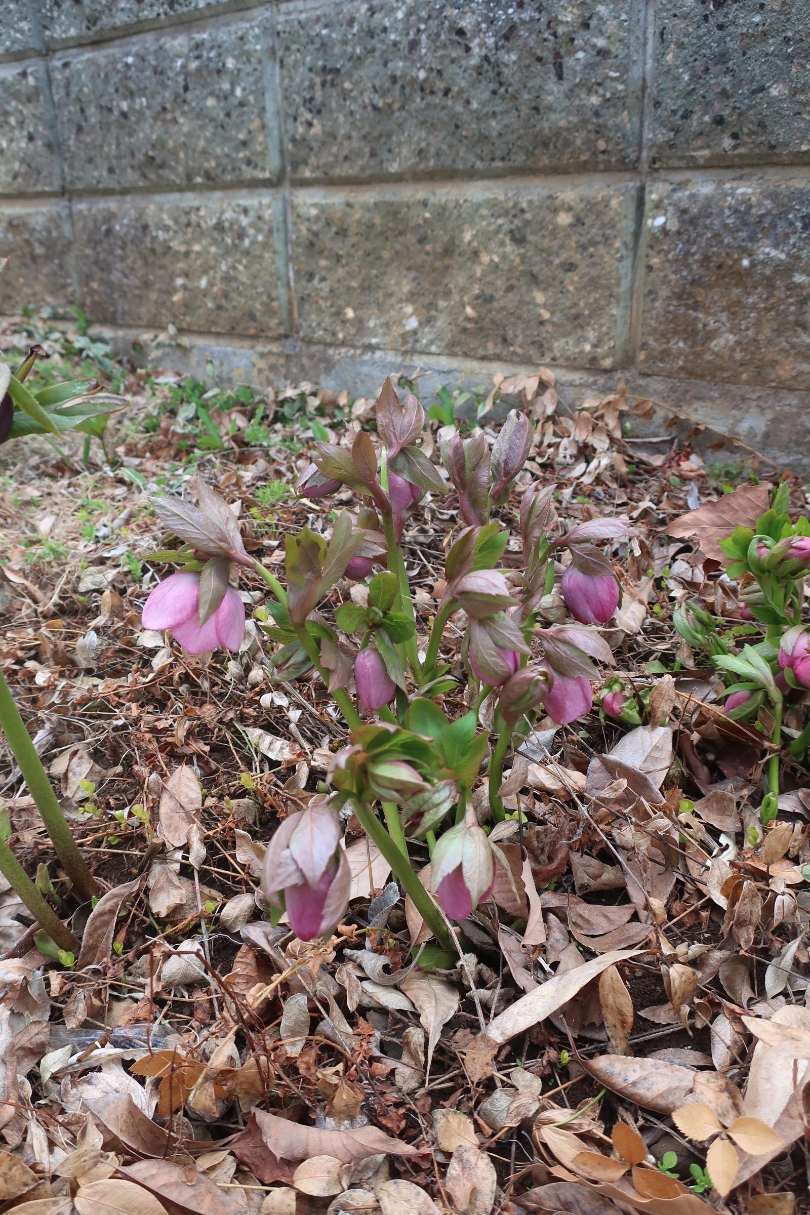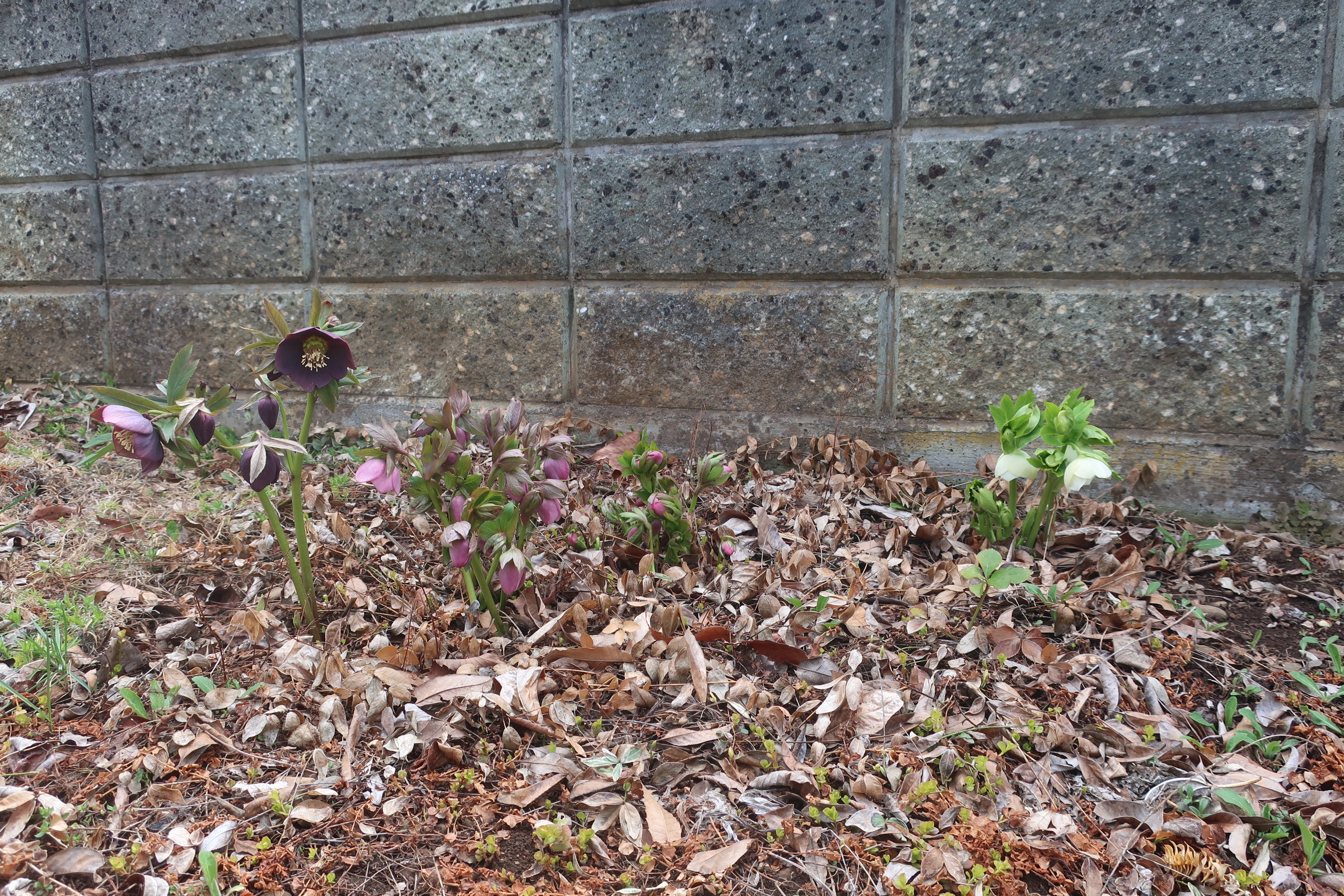 クリスマスローズコーナー。 枯れ葉の吹き溜まりになる場所で、かなり片付けたんだけど、風が吹くたび枯れ葉が集まってくる。