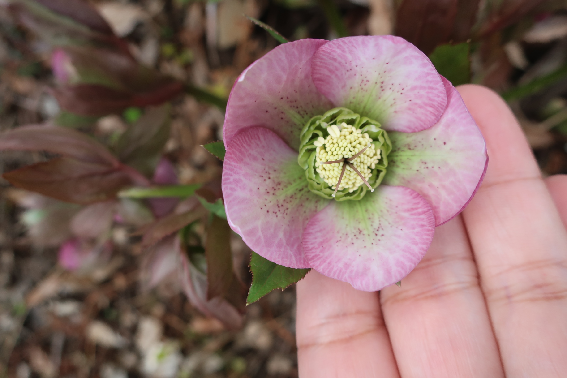 お顔はこんな感じ。 わが家のクリスマスローズは全部一重咲き。