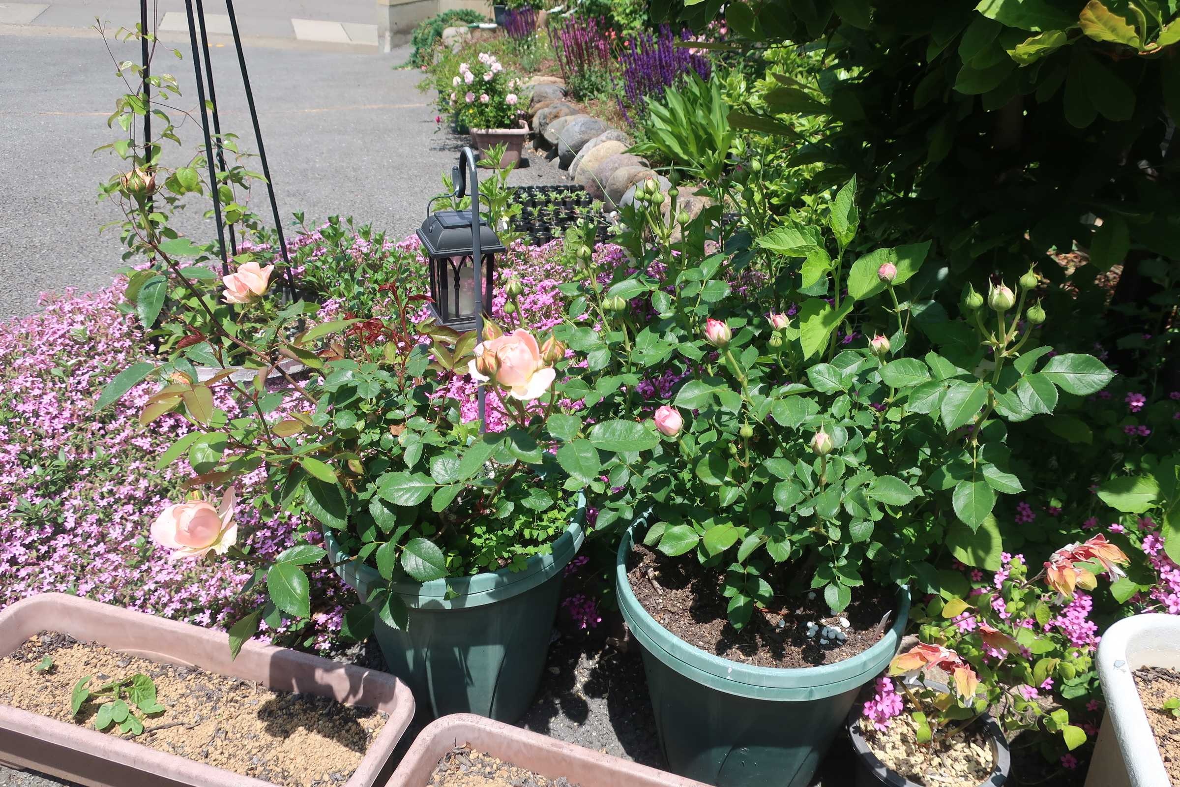 鉢植えの2品種は切り花品種で、左はモンシュシュ、右はフェアリーカップ。