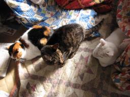 ふく♀湯たんぽの上に乗って、足を舐め舐め~毛繕い中!奥で目が光ってるのは、下の段にいてるサチ♀ 左サチ♀は、下の段から上がってきたよ~。ふく♀は後ろに下がってる。11日は何かあったかな??今朝も((´д`)) ぶるぶる・・・さむ~~い。と、いうよりも、昨夜からサムイニャ♪.....(((((ヾ( o=^・ェ・)o ┏━┓←コタツ最低気温はマイナス4度~。冷えすぎ~~。道路もコチコチに凍結~。道路は、塩を撒きまくり~でした。朝から晴れたり曇ったり~。凍結してる道路も、塩を撒いてたのと、太陽の日差しで、凍結も溶けてきてた~。σ(^_^)アタシは、午後2時半に歯医者に予約を入れてたので、道路の凍結がなくなってε-(´▽`) ホッ!(自分の車を運転して行ってるので、スタッドレスタイヤだけど、凍結があると、怖くて行けないから~。)去年からお世話になってる市内にある歯医者さんに、30分余りかけて行ってきた~。歯茎の腫れは治まってるけど、まだ、治療があるそうで診てもらってます。今日は晴れたり曇ったり~。風は冷たく、寒い一日になりました。なので、夕ご飯は鍋~~。鶏肉と豚肉の水炊き~。(ポン酢に大根おろしとネギ入れて食べてます。)後、今日11日は鏡開き~。 ぜんざいを作って食べたよ~。 様子見が続いてる(=^-^=)達は、現在4匹。(ふく♀チビスケ♂大♂雄♂)まだまだ手がかかってます。申し訳ないですが、暫くは、いつまでになるのか分からないですが、読み逃げが、多くなりそうです。本日の“〆(^∇゜*)カキコ♪は、できたり、できなかったり~。レスのお返事は暫くは無理みたいです。度々で、ごめんなさい。