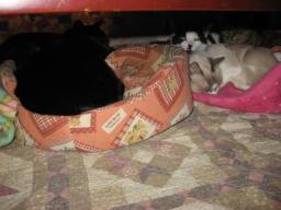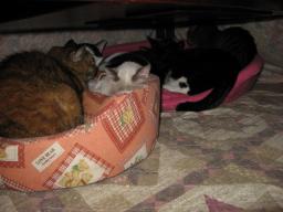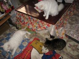 21日までは、痩せてても、いつもと同じような行動をしてたのになぁ~。それが、それが・・・。本当に急でした。お星様になったチビスケ♂お空の上から、皆のことを見守っててね。20日21日に撮った画像です。↓チビスケ♂PCやってるお母さんの横で座ってる。向きを変えたところを~~。 左からデコ♀寅♂チビスケ♂の猫団子 左にウンチッチ♂横にデコ♀手前にチビスケ♂が座ってる。左ウンチッチ♂真ん中にチビスケ♂右はチャッチャ♀こたつの中の猫ベットで。ウンちゃんは、猫ベットの中の座布団?の下に、いつも潜り込んでるねぇ~。皆様方の温かいお言葉、励ましのお言葉、ありがとうございました。m(__)m23日は何かあったかな??今朝も((´д`)) ぶるぶる・・・さむ~~い。寒さが続いてますよ~。サムイニャ♪.....(((((ヾ( o=^・ェ・)o ┏━┓←コタツ最低気温はマイナス1.8度~。少し冷え込みがましだったかなぁ~?今日は、曇り空。太陽が照ってないので、寒かった~。様子見が続いてる(=^-^=)達は、3匹になりました。(ふく♀大♂雄♂)まだまだ手がかかってます。申し訳ないですが、暫くは、いつまでになるのか分からないですが、読み逃げが、多くなりそうです。本日23日の“〆(^∇゜*)カキコ♪は、できなかったです。レスのお返事は暫くは無理みたいです。度々で、ごめんなさい。