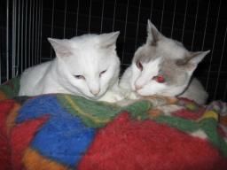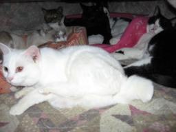 我が家の大家族24匹の(=^-^=)達からも、あけましておめでとう~~。昨年と変わらず、(*・.・)ノ ヨロシクニャン・:*:・゜'★.。・:*:・゜'☆♪見てる人も多いと思うけど、知ってる人も多いと思うけど、うちの(=^-^=)達の、短い紹介です。シロッチ♂目はブルー。生後数ヶ月の時、車に後ろ足を轢かれ、大手術!金具?が足に入ってます。寒くなると、少し「びっこ」を引いてます。 ウンチッチ♂目はブルー。生まれつき、自力でトイレができない!自分でトイレができないので、一日三回お尻を洗って、(下痢とかの場合は、洗う回数が増えます)赤ちゃん用の紙パンツ穿いてます。シロッチとウンチッチは兄弟です。左クロッチ♂2007年2月15日に片目を失明!片目しか見えないけど、"o( ̄‐ ̄*)ゲンキ!!右チャッチャ♀歯が抜けていってます。が、カリカリフードも食べてます。クロッチとチャッチャは兄妹(姉弟)です。「シロッチ」「ウンチッチ」「クロッチ」「チャッチャ」4匹は、今年14歳になります。 ヤンチャ♀慢性の膀胱炎になってて、年1~2回、季節の変わり目や、急に寒くなると膀胱炎になりやすいです。今年13歳になります。チビスケ♂元々痩せてるんだけど、病気の為なのか?痩せてきてます。様子見猫です!今年12歳になります。 あい♀目はブルー。保護した生後1ヶ月余りの時から、左後ろ足が切れて?(足首から下がなし)なかった!5年前に手術して、ない足がもっと短くなりました。「3本足のあい」です。スリリン♀2歳になろうとした年、前足をブラブラにしてエサを食べに来て、どうにか捕まえて、獣医さんとこに。即、右前足切断!腐ってました。3本足になりました。「あい」と姉妹です。3本足姉妹です。でも、姉妹と思ってないみたいで、仲が悪いです。 デコ♀とボク♂姉弟(兄妹)家のすぐ下の敷地に、町内のスーパーのビニール袋に2匹入れられて捨てられてたョ。ボクは、尿石症で、それ専用のフードを食べてます。「あい」「スリリン」「デコ」「ボク」4匹、今年8歳です。手前サチ♀「オッドアイ」ふく♀「三毛猫」姉妹。ふく♀は、歯の抜歯手術をしてからも、口の中の調子が悪いので、様子見が続いてます。サチ♀は、喧嘩が元で去年胸のあたりを手術したけど、今は元気になってます。 きじ丸♂庭に来た時、庭に繋がれてる「あい姉ちゃん」に襲われ、死に掛けたョ。獣医さんにサジを投げられ、生死を彷徨ったけど、お母さんの介護のおかげで何とか生き延びました。(兄弟の「タロウ」は、去年の6月に亡くなって、寂しくなりました。)「ふく」「サチ」「きじ丸」3匹、今年で5歳です。後ろは元気♂前はエル♀母猫が猫バルボにかかって、生死を彷徨ってる時に生まれたョ。何匹生んだのかも分からず、母猫に置いてけぼりされた元気です。生後3~4日目だったかな?保護して貰ったョ。その時の病気が原因だと思うけど、元気は後ろ足が少しおかしい。エルは、身体が大きくならないし、手足が短い。歩き方も少し変!足がおかしいです! 寅♂元気・エルの3匹は兄妹です。母猫の猫バルボが原因で、、生まれつき身体が不自由です。(肢体不自由猫)四足で立って、歩けないです。歩こうと思っても、1~3歩で、バタッ~と倒れます。でも、今は体力もついてきて、2~5歩歩いては倒れてますが、倒れても倒れても、歩こうと頑張ってます。華♀生後5~6日だったかな?母猫が育猫放棄!で、保護したョ。「元気」「エル」「寅」「華」4匹、今年4歳になります。 ホワイト♂道路を挟んだ、下の敷地に捨てられてたョ。保護した時は、ガリガリで風邪をひいて、ノミだらけ~でした。風邪は治るまで長くかかったです。今年3歳になります。純♂「オッドアイ」毛が少し長いです。ミコ♀「三毛猫」と兄妹(姉弟)です。 健♂「オッドアイ」「純」「ミコ」「健」3匹は今年2歳になります。ナツ♀目はブルー。毛が少しだけ~長いです。「元気・エル・寅」3兄弟と「純・ミコ」2兄妹と「ナツ」は兄妹です。左雄♂と右大♂目はブルー。似すぎてるので、尻尾が見えないとどっちがどっちなのか、分からない~~。去年からの風邪ひきが中々治らないです。長引いてます。様子見猫です。「華」と「健」と「雄と大」は姉弟です。「ナツ」「雄」「大」は今年1歳になります。 1日は何かあったかな??午前中は晴れ~~。お昼からは、曇ってきて、午後2時前から1時間余り雪が降った~。その後は、雪も止み、曇り空になりました。今日も((´д`)) ぶるぶる・・・さむ~~い一日になりました。様子見が続いてる(=^-^=)達は、現在4匹。(ふく♀チビスケ♂大♂雄♂)まだまだ手がかかってます。申し訳ないですが、暫くは、いつまでになるのか分からないですが、読み逃げが多くなりそうです。本日の“〆(^∇゜*)カキコ♪は、できたり、できなかったり~。。読み逃げも、行けたり行けなかったり~。m(__)mレスのお返事は暫くは無理みたいです。度々で、ごめんなさい。