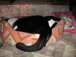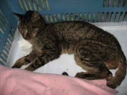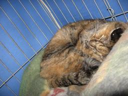 去年9月28日に「腎臓病」の「腎不全」で、「尿毒症」と診断され、もう手の施しようがないと言われてた「チビスケ」♂。尿毒症の方は、その後良い方向に向かってたんだけど・・・。今年1月18日の2~3日前から、エサが食べずらくなってきたので、獣医さんとこに行ったんだけど・・・。芳しくないですねぇ~。もう長くないでしょうと言われてたんですが・・・。21日までは、o(- ̄*o))))...ウロウロ...((((o* ̄-)oしてたんだけど。22日の朝、ケージから居間まで、歩く姿を見たら、ヨロヨロ~になってて、コタツの中のみの移動しかできない。夕方には、もう歩けない状態になって・・・。夜は、抱っこして大きな篭に入れて、身体を横たえてるだけ~~の状態でした。23日も篭の中で、身体を横たえたまま、居間に来てたんだけど・・・。午後5時20分、静かに息を引き取りました。(T_T)明日か明後日に、すぐ上の敷地に埋葬します。3年前に亡くなった「マキ」去年亡くなった「タロウ」の近くに埋葬する予定です。 チビスケ♂亡くなる2時間前の画像です。もう、動けず、身体を横にしてる状態でした。チビスケ♂1999年6月4日に来て2011年1月23日午後5時20分に亡くなりました。我が家に来て、11歳7ヶ月20日目でした。申し訳ないですが、本日は、皆様方の所へお邪魔ができそうにないです。読み逃げも、できないかも~~です。度々で、ごめんなさい。
