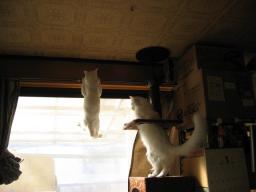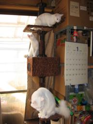純♂一番上で、身体を舐め舐め~~。(純く~~ん、舐めるのに夢中になって、落ちないでねぇ~) 純♂は一番上から、下にいるナツを見てる。下にいるナツ♀は、窓から外を見てる。(ナッちゃん、何を真剣に見てたの~?)大♂BOXの上から、どこ見てるの~?(下に雄くんがいてたの~?)15日は何かあったかな??今朝も((´д`)) ぶるぶる・・・さむ~~い。寒さが続いてますよ~。サムイニャ♪.....(((((ヾ( o=^・ェ・)o ┏━┓←コタツ最低気温はマイナス3.5度~。冷えすぎ~~。道路は凍結~。毎日塩を撒いてるみたい。道路には、撒いた塩が残ってる~。今日も、晴れたり曇ったり~。午後3時過ぎから、雪が舞ってきた~~。夕方には、薄っすら白くなってたよ~。時間が経つにつれ、冷え込みも厳しくなってます。グングン冷え込んでま~~す。昨日、寅に爪を入れられたσ(^_^)アタシの手のひら。まだ、ジンジンと痛みは残ってます。腫れはひきました。ε-(´▽`) ホッ!様子見が続いてる(=^-^=)達は、現在4匹。(ふく♀チビスケ♂大♂雄♂)まだまだ手がかかってます。申し訳ないですが、暫くは、いつまでになるのか分からないですが、読み逃げが、多くなりそうです。本日の“〆(^∇゜*)カキコ♪は、できたり、できなかったり~。レスのお返事は暫くは無理みたいです。度々で、ごめんなさい。