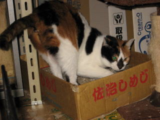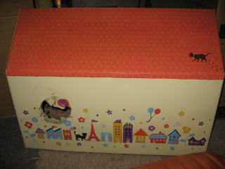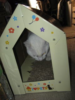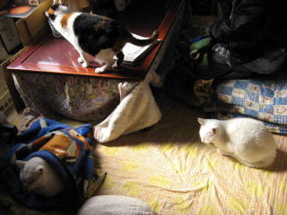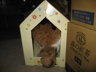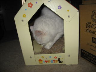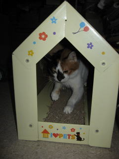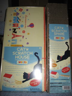 matumo5523さんから頂いた、『キャットスクラッチハウス』ダンボールの爪とぎは、ゴミがたくさん出るけど、個室感覚を好むにゃんこが多いので、大人気で~~す。matumo5523さ~~ん、~(=^‥^)/。・:*:・゜★,。・:*:・゜☆ ありがとニャ!今回は、ふく♀がキャットスクラッチハウスの中でバリバリやってま~す。24日は何かあったかな??今朝の最低気温はマイナス2.6度~。最高気温8.0度。朝から晴れたり曇ったり~。強風が吹き荒れた、((´д`)) ぶるぶる・・・さむ~~い一日でした。様子見(=^-^=)達は、スリリン♀ふく♀ホワイト♂あい♀デコ♀ボク♂の6匹毎日の飲み薬(=^-^=)達は、スリリン♀ふく♀ホワイト♂デコ♀ボク♂の5匹3匹の薬は、缶詰に混ぜてます。ホワイト♂ボク♂は、シリンジで飲ませてます。まだまだ手がかかってます。申し訳ないですが、暫くは、コメントへのお返事は無理みたいです。