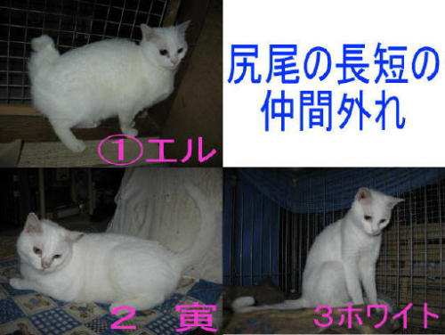 10~13日までの一日1問の新クイズにご参加、ありがとうございました。m(__)m10日の新クイズ尻尾の長短の仲間外れです。エルの尻尾は短いので、正解は111日の新クイズ目の色の仲間外れです。サチだけ、目の色が逆なので、正解は312日の新クイズ尻尾の長短の仲間外れです。雄の尻尾が短いので、正解は213日の新クイズ尻尾の長短の仲間外れです。デコの尻尾が長いので、正解は2正解は1日目ー12日目ー33日目ー24日目ー2ご参加の方々の解答は1 ao1259 さん 1-3-3-22 pepehousu0603 さん1-3-3-23 ニャンタaiko さん 1-3-2-14 なすこの親分 さん 2-3-2-25 きじとらのはは さん 1-3-1-26 もみじ1222 さん 1-3-1-17 matumo5523 さん1-2-1-28 pico5404 さん1日目2 3日目3 4日目29 はやま1670 さん2日目310ちぇざ8003 さん4日目2正解者はなし~~でした。上記1~5番の3問正解の方々の中から、抽選で1名様にプレゼントです。(バタバタしてて、抽選ができなかったので、抽選は1~2日の内にやりますね。もう少し待っててくださいね。)ご参加、ありがとうございました。m(__)m18日は何かあったかな??今朝の最低気温は1.7度~。最高気温5.5度。昨夜から降りだした雨は、今日もまだ、降り続いてます。シトシトと降ってま~す。((´д`)) ぶるぶる・・・さむ~~い雨降りの一日になりました。様子見(=^-^=)達は、スリリン♀ふく♀ホワイト♂あい♀デコ♀ボク♂の6匹毎日の飲み薬(=^-^=)達は、スリリン♀ふく♀ホワイト♂デコ♀ボク♂の5匹3匹の薬は、缶詰に混ぜてます。ホワイト♂ボク♂は、シリンジで飲ませてます。まだまだ手がかかってます。申し訳ないですが、暫くは、コメントへのお返事は無理みたいです。