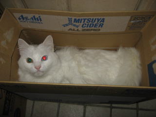 僕、オッドアイの純♂です。箱が大好きで~~す。玄関に置いてる箱に入ってます。^^今日2月14日はバレンタイン~ということで。。。お父さんの大好きなガーナチョコは、ちょっとだけ~。カークランドのレーズンチョコ~1つには、1530グラム入ってますよ~。お父さんもお母さんも大好きだから、いっ~~ぱい買っちゃいました。^^新クイズ10日~13日まで、一日1問出題で4問やってました。(詳しくは10~13日の日記を覗いてね。)締め切りは、17日日曜日午後11時59分です。10日~13日までの4問正解者1名様に、気持ちだけ~~ですが、プレゼントあります。(国内限定)(正解者多数の場合は、抽選とさせて頂きます。m(__)m)フォロワーしてくれてる方々も、参加してみませんかぁ~?ご参加、お待ちしてま~~す。(*・.・)ノ ヨロシクニャン・:*:・゜'★.。・:*:・゜'☆♪13日は何かあったかな??今朝の最低気温は0.3度~。最高気温6.6度。午前中は、雲が多く、薄日も射し、時折、時雨れる空模様。午後からも、雲の多い、薄日も射す空模様。((´д`)) ぶるぶる・・・さむ~~い一日でした。様子見(=^-^=)達は、スリリン♀ふく♀ホワイト♂あい♀デコ♀ボク♂の6匹毎日の飲み薬(=^-^=)達は、スリリン♀ふく♀ホワイト♂デコ♀ボク♂の5匹3匹の薬は、缶詰に混ぜてます。ホワイト♂ボク♂は、シリンジで飲ませてます。ボク♂薬は1種類、一日3回。焼きカツオや魚等、缶詰はボチボチと、食べる量も、食べる回数も、増えてきました。カリカリフードの食べる量は、まだ少ないけど、少しずつでも食べるようになりました。この調子で、頑張って食べようねボク♂まだまだ手がかかってます。申し訳ないですが、暫くは、コメントへのお返事は無理みたいです。