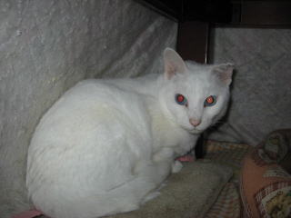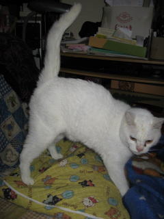 あい♀今年で10歳になります。あいの後ろ左足は、生後1ヶ月余りで保護した時から、くるぶしの下から無かったです。成長と共に、骨も成長して、先っぽの骨が尖ったようになり、痛みが増すようになり、先生と相談して、3歳になった11月に手術して、もっと短くなりました。その後は、痛みはないようです。コタツの中から、こっち向いてくれた。左耳は、「耳血腫」に2011年12月になり、餃子の皮みたいにしわしわになってます。爪とぎ箱に移動中。25日は何かあったかな??今朝の最低気温はマイナス3.1度~。最高気温9.6度。朝から晴れたり曇ったり~。日中は、少し暖かく感じたョ。様子見(=^-^=)達は、スリリン♀ふく♀ホワイト♂あい♀デコ♀ボク♂の6匹毎日の飲み薬(=^-^=)達は、スリリン♀ふく♀ホワイト♂デコ♀ボク♂の5匹3匹の薬は、缶詰に混ぜてます。ホワイト♂ボク♂は、シリンジで飲ませてます。まだまだ手がかかってます。申し訳ないですが、暫くは、コメントへのお返事は無理みたいです。