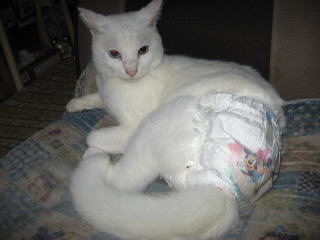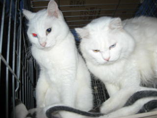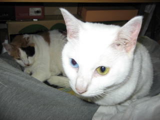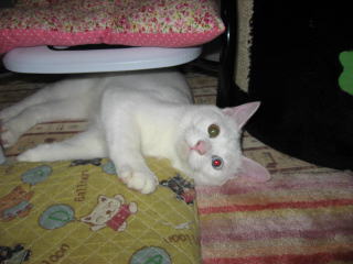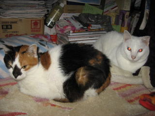 我が家は、にゃんこの大家族~。あけましておめでとう~~にゃんにゃん。今年も、(*・.・)ノ ヨロシクニャン・:*:・゜'★.。・:*:・゜'☆♪(見てる人も、知ってる人も、多いと思うけど、我が家のにゃん達の、短い紹介です。去年と殆ど同じです。m(._.*)m)あい♀目の色はブルー。保護した生後1ヶ月余りの時から、左後ろ足が切れて?足首から下がなかった!9年前に手術して、ない足がもっと短くなりました。「3本足のあい」です。2011年12月に「耳血腫」になり、左耳は餃子の皮みたいに、シワシワになってます。スリリン♀目の色は金色2歳になる年に、前足ブラブラでエサを食べに来て、なんとか捕まえ、獣医さんとこへ。即、右前足切断!腐ってました。3本足になりました。2011年から口の中の調子が悪くなり、1~2ヶ月に1回、注射打って、薬も飲んでます。「あい」と姉妹です。3本足姉妹です。でも、姉妹と思ってなく、仲が悪いです。左ボク♂と右デコ♀姉弟(兄妹)目の色は金色家の下にある敷地に、町内のスーパーのビニール袋に2匹入れられて捨てられてた。ボクの尿石症。よくなってるけど、それ専用のフードを混ぜてます。2011年7月に元気と喧嘩して、首の傷が化膿して手術。抜糸までの16日間、包帯の替えが二人かかりで大変でした。デコとボクも一昨年7月から口や喉が悪くなり、1~2ヶ月に1回、注射打って、薬も飲んでます。「あい」「スリリン」「デコ」「ボク」の4匹、今年12歳左サチ♀オッドアイ」右が金色、左はブルー2010年10月元気と喧嘩して、右胸のあたりを手術しました。右ふく♀「三毛猫」目の色は金色2010年7月、奥歯の抜歯手術後も口の中の調子が悪く、1~2ヶ月に1回、注射打って、薬も飲んでます。ふく♀「三毛猫」とサチ♀「オッドアイ」似てない姉妹は今年8歳右きじ丸♂目の色は金色。今年8歳庭に来た時、庭で繋がれてた「あい姉ちゃん」に襲われ、死に掛けた。獣医さんにはサジを投げられ、生死を彷徨ったけど、母ちゃんの介護のおかげで何とか生き延びた。2011年6月元気と喧嘩で、胸の傷口が化膿して手術。抜糸までの2週間は大変でした。左ホワイト♂目の色は金色。今年7歳道路を挟んだ、我が家の下の敷地に捨てられてた。保護した時は、ガリガリで風邪をひいて、ノミだらけ~。風邪は治るまで長くかかったです。膀胱炎で数ヶ月に1回注射打って、薬は毎日飲んでます。左に華♀目の色は金色。生後5~6日だったかな?母猫が育猫放棄!で、保護。中奥にエル♀目の色は金色。身体が大きくならないし、手足が短い。歩き方も少し変!足がおかしいです。右は元気♂目の色は金色。母猫に置いてけぼりされたョ。生後3~4日目だったかな?保護。普通の猫に比べると、後ろ足の形がおかしい。変ですョ。2009年にサチと喧嘩で、腕を噛まれ化膿。手術しました。寅♂目の色は金色母猫の猫バルボが原因で、、生まれつき身体が不自由です。(肢体不自由猫)幼いときは、四足で立って、歩けなかった。いつも転がってた。今は体力もついて2~5歩、歩いては倒れてますが、倒れても倒れても、歩こうと頑張ってます。いつも母ちゃんの側にいます。元気♂エル♀寅♂華♀の4にゃん、今年8歳左は健♂オッドアイ右がブルー、左は金色。おしっこ引っかけたい~なので、紙パンツ穿いてます。右は純♂オッドアイ右が金色、左はブルー。毛が少し長く、ふわふわしてます。右ミコ♀「三毛猫」目の色は金色。太ってて、コロコロしてます。ちっ~とも痩せないねぇ~。純♂オッドアイとミコ♀三毛猫は、似てない兄妹(姉弟)です。純♂ミコ♀健♂は今年7歳左ナツ♀目の色はブルー。今年5歳毛が少しだけ~長いです。水容器におしっこするので、紙パンツ穿かせてます。左は雄♂右は大♂兄弟。目の色はブルー。今年5歳似すぎてるので、尻尾が見えないとどっちがどっちなのか、分からない~~。大は慢性鼻炎で、寒くなると、少し鼻の調子が悪いです。右は蘭♀「オッドアイ」右がブルー、左は金色。今年4歳まだまだ遊び盛りです。左は天♂「オッドアイ」右がブルー、左は金色。今年3歳生後1~2ヶ月の頃、物置の古いビニールシートが紐状になってたのに引っ掛かり、動けば動くほど絡まって、\(>oo