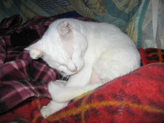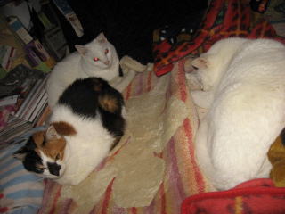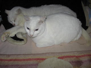 純♂とツーショット~~。白にゃんこが多いけど、純くんは、ふわふわだから、すぐ分かるよねぇ~。左は健♂と左後ろは寅♂と左にマリ♀と右下はナツ♀と右後ろにミコ♀と13日は~~最低気温0.4℃最高気温10.3℃朝から晴れたり曇ったり~。やっぱり風の((´д`)) ぶるぶる・・・さむ~~い一日でした。様子見(=^-^=)達は、スリリン♀ふく♀ホワイト♂デコ♀ボク♂の5にゃん毎日の飲み薬(=^-^=)達は、スリリン♀ふく♀ホワイト♂デコ♀ボク♂の5にゃん5にゃんの薬は、缶詰に混ぜてます。まだまだ手がかかってます。申し訳ないですが、暫くは、コメントへのお返事は無理みたいです。