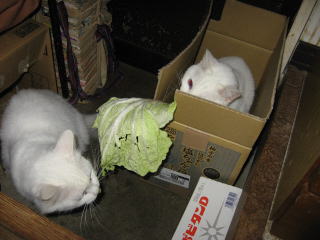 勝手口に白菜を置いてたら~~。箱の中に持ち込もうとしてるのかな?蘭♀左で白菜の葉っぱにかじりついてるアキ♀箱の中で蘭♀外にアキ♀は葉っぱをガジガジ。右で見に来たのは将♂箱の中でガジガジ中の蘭♀休憩中かな?アキ♀箱の中で蘭♀外でアキ♀はガジガジ中。左の椅子の上で見てるのはマリ♀右は又見に来た将♂まだまだガジガジ中のアキ♀箱の中の蘭♀は椅子の上にいるマリ♀が気になるのかにゃ~?左丸椅子の上にマリ♀手前はアキ♀箱の中の蘭♀は、下に入って来たナツ♀が気になるのかにゃ~?12月9日から認知症の母と暮らし始めて、毎日バタバタ続きで、ゆっくりPCに向かう時間がなくなってます。母は今月5日から、新しいデイサービスに通ってます。(自宅から車で片道10~15分)朝のお迎え時間は、午前8時10分~40分の間に。帰宅時間は、午後4時前~午後4時20分の間に。行ってる間は、少しゆっくりできるかなぁ~?と思ってたけど・・・。まだまだ母のことで、電話かけて問い合わせしたり、アチコチに行ったりしてるので、ゆっくりできるのは、もう少し後になりそうです。申し訳ないですが、もう暫くは、簡単日記になると思います。もう暫くは、皆様方の所にお邪魔できないかも知れないです。m(._.*)m8日は~~最低気温1.3℃最高気温7.2℃朝から雲の多い空模様。時折晴れ間も覗いてたけど、小雨もパラつくお天気だったよ~。風がヒンヤリ{{ (>_