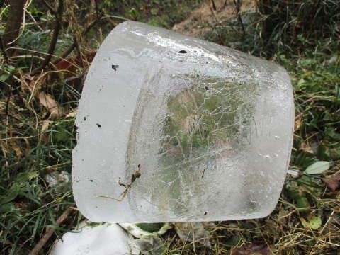 外のバケツに氷が張ってて~~