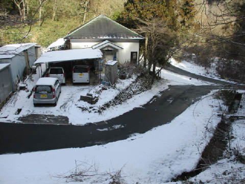 家の上の道路から融雪剤(凍結防止剤)を昨日の夕方撒いたので、車の通る幅ぐらいの雪は解けてます。