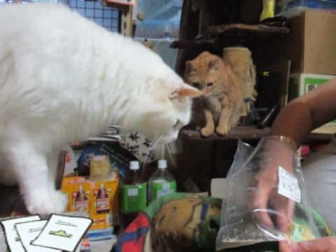 ロンボーの上はマリ♀爪とぎハウスの上に蘭♀右で、ちょこんと座ってるのは天♂