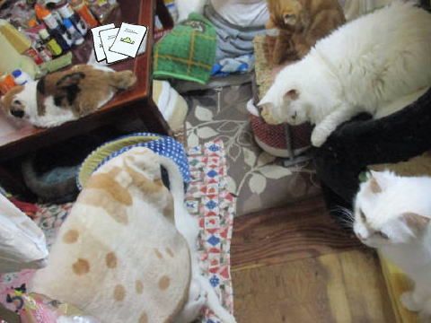 座椅子の後ろは寅♂爪とぎハウスの上に純♂ロンボーの上にナツ♀