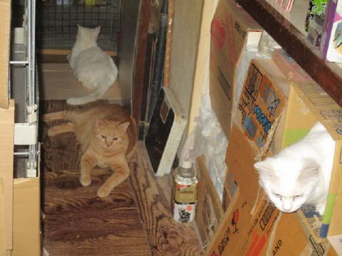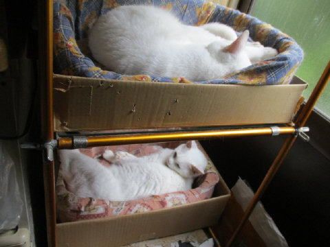 勝手口のパイプ棚の上はマリ♀下にホワイト♂
