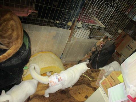 台所から、白にゃんこが荷物用の黄色い紐を咥えてきて、遊び始めたよ~