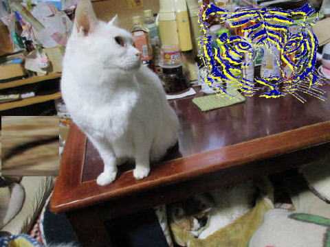 コタツ上のハル♀タワーに行くの~?下の猫ベットのミコ♀ネムネム?